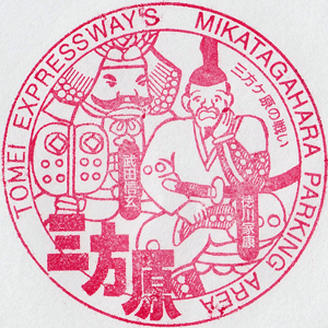 | 絵柄説明 : 「武田信玄・徳川家康 三方ヶ原の戦い」 (2017年3月 施設名称を「みかたがはら」→「みかたはら」へ呼称変更) スタンプは現状のまま「MIKATAGAHARA (みかたがはら)」となっている。 |
