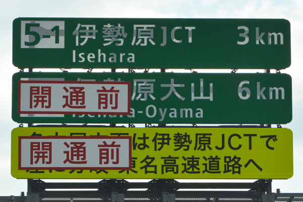 伊勢原大山ICの開通目前~直後にかけては、誤解や誤案内を防止として、暫定的に「開通前」と記されたステッカーが貼付けられ、開通後に剥がす作業が行われたようです。(写真は開通直後に撮影したものですが、開通前のステッカーはまだ剥がされていない状態でした) |