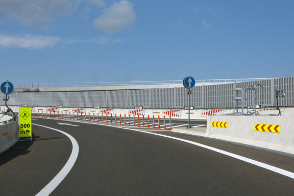 ここから先は現時点で未開通。終点(終端部)のICのため、出口ランプウェイからそのまま流出するのみとなっています。