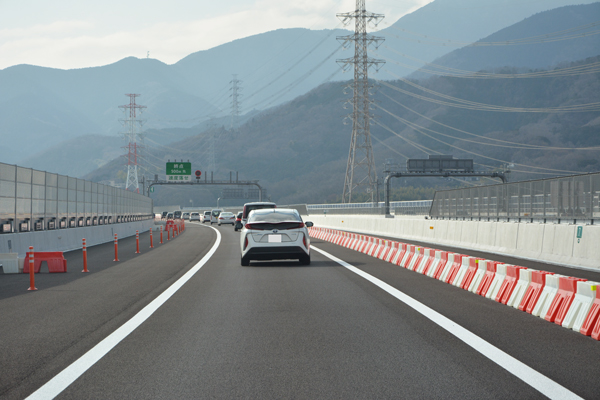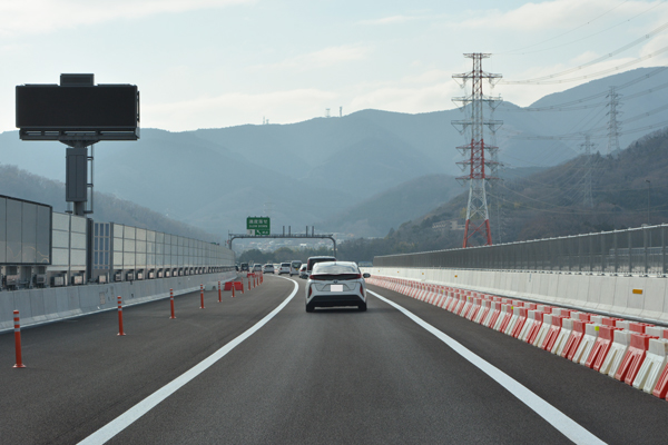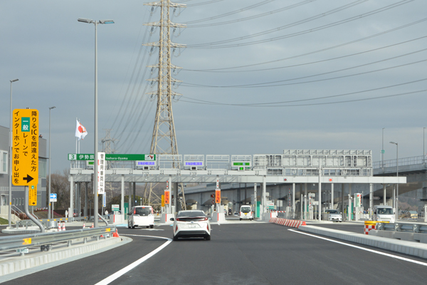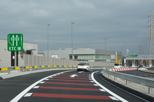 取材当日は開通初日ということもあり、出口は料金所付近まで多くの車列が連なっていました。 |