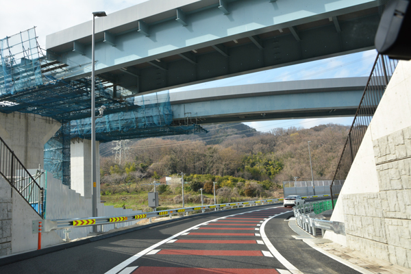 伊勢原大山ICの出口ランプウェイからは、引き続き秦野・御殿場JCT方面への延伸開通に向けて事業中の新東名高速道路の本線建設現場の様子を窺うことができます。